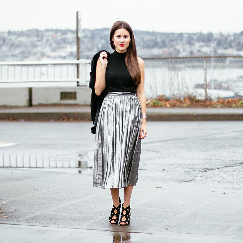 Металик варијантата, особено онаа со златен сјај е секогаш во тренд. Нека моделот на здолништето биде плисиран. Одлучете се за боди со долги ракави и затворени обувки. Ноќите станаа постудени.