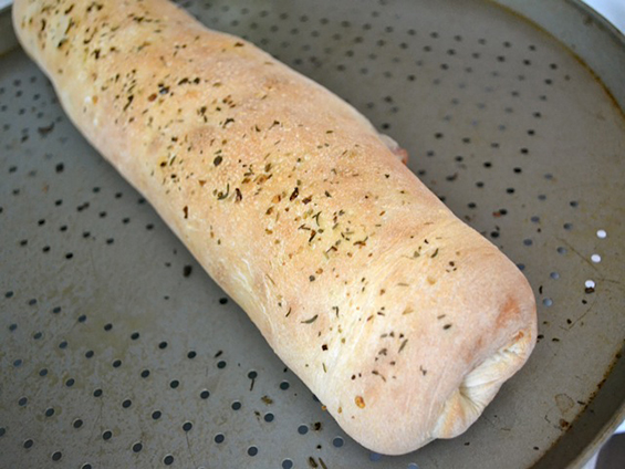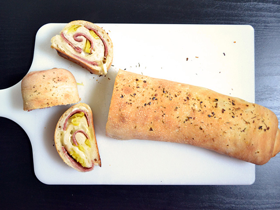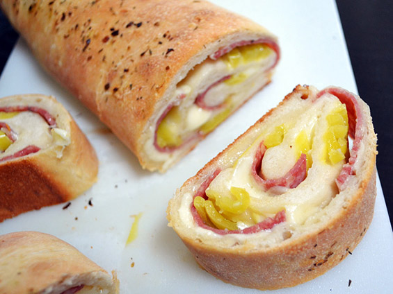 5. Загрејте ја рерната на 200 степени Целзиусови. Печете 25 минути или додека горниот дел од ролатот да добие златно-кафена боја. Исечете го стромболито на 12 парчиња. Уживајте!