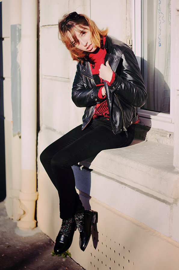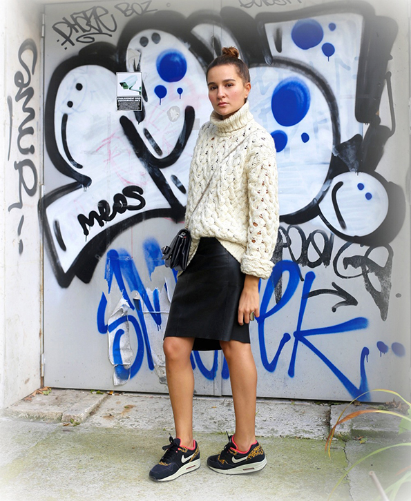 Тесното кожно здолниште предизвикува уште поголема интрига кога му парира на дебел плетен џемпер и патики.