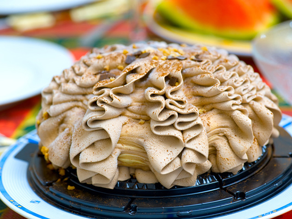 Изматете ја слатката павлака, а шлагот направете го според упатството на кесичката заедно со зацвсртувачот. Во изматениот шлаг додајте ја нутелата и сето тоа соединете го со мешање. Спојте ја изматената слатка павлака и кремот од чоколадо, па ставете ја смесата во фрижидер. Земете чинија на која ќе ја служите тортата, и со црпалка ставете една лажица од смесата. Веднаш ставете ја чинијата во ладилникот пуштен на најјако и оставете да седи 10 минути. После 10 минути извадете ја чинијата и врз првиот слој, ставете втор, повторно црпнувајќи од смесата со црпалка. Вратете ја чинијата во ладилникот и повторувајте ја постапката додека не ја потрошите смесата, а последниот слој можете да го нанесете со помош на кеса за декорирање за да направите тортата поубаво да изгледа. Пред служење посипете ја тортата со какао.
