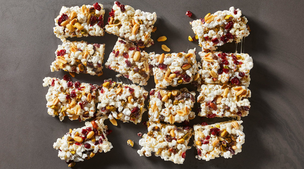 - Ставете ги пуканките, сувото грозје, брусницата, кикиритките и ф’стаците во голем сад.