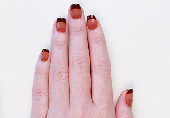 3. Обојте го долниот дел од ноктот со едната нијанса, а другиот дел (до коренот) со другиот лак.