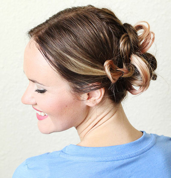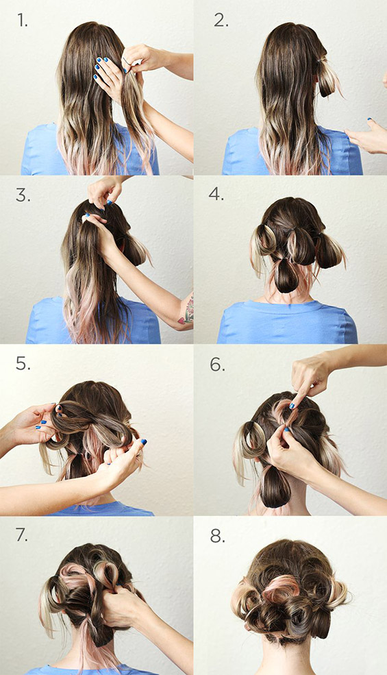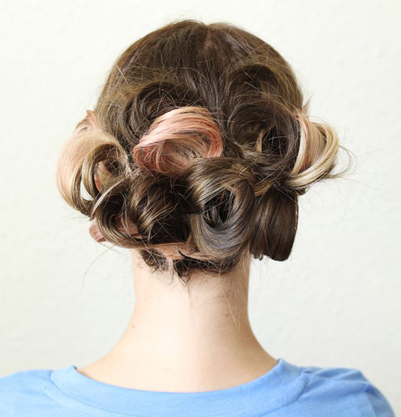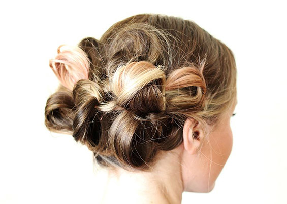 Фатете неколку опавчиња со тенки ластичиња на задниот дел од главата, но при последното вртење околу косата, не извлекувајте го праменот докрај. Потоа поделете ги поголемите јамки на неколку помали делови и прицврстувајте ги за главата со шноли. Направете го ова со сите јамки и тоа е сè. Вашата фризура е готова.