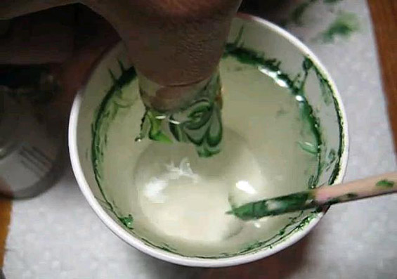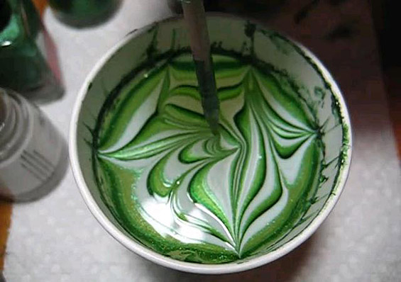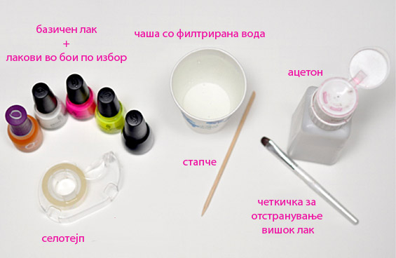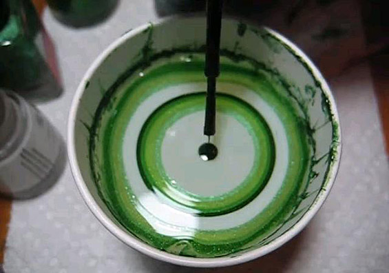Земете ја чашата со филтрирана вода и врз неа пуштете само една капка од лакот што сте го избрале како прв. Бојата многу брзо ќе се рашири на површината на водата. Менувајте ги боите на лаковите, капка по капка, сè додека не добиете центар кој наликува на оној од табла за стрелање.