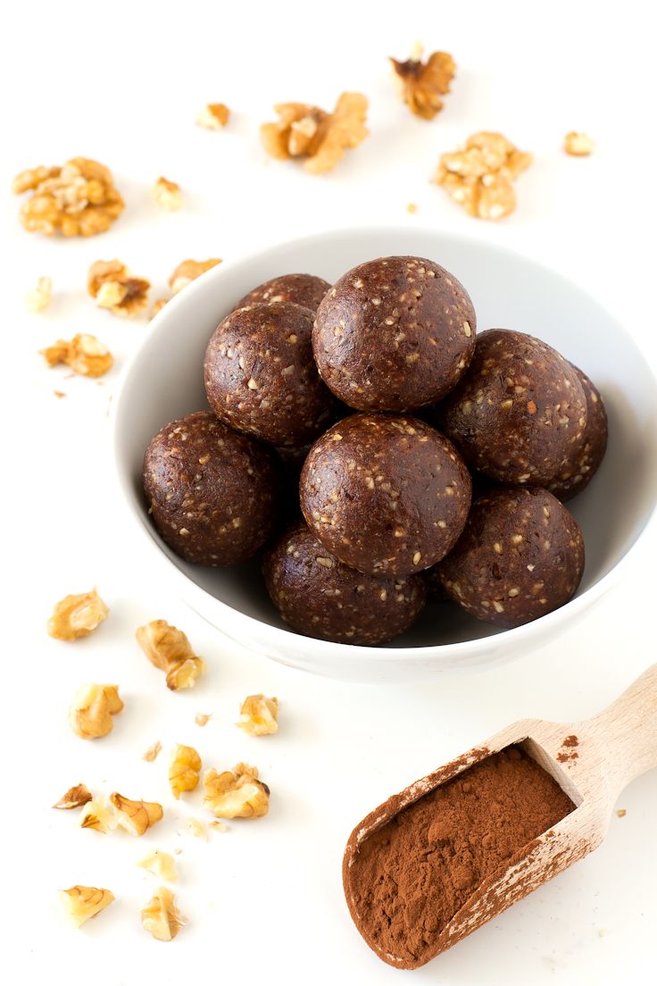 Најпрво ставете ги оревите во блендер и мелете додека не забележите дека сте добиле смеса во прав. Додајте ги урмите и какаото и мелете додека не се добие изедначена смеса.