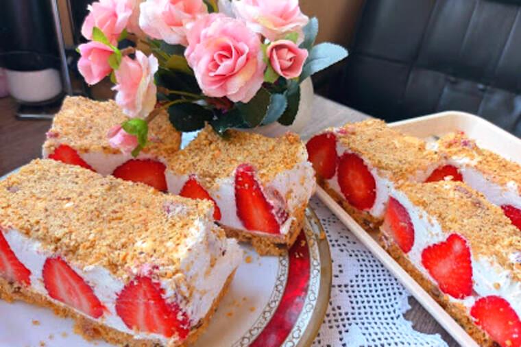 Оставете ја смесата да стои во замрзнувач 30 минути. Во меѓувреме, изматете ги слатката и киселата павлака. Стопете го желатинот како што пишува во упатството за употреба и полека додајте го шлагот. Внимавајте да не ја изматите киселата павлака премногу и да се направат грутки. Наредете половина сантиметар шлаг на смесата од замрзнувачот и потоа наредете јагоди. Додајте го остатокот од шлагот и израмнете. Одозгора ставете чоколадна глазура или мелени ореви. Оставете ја тортата да отстои во фрижидер преку ноќ.