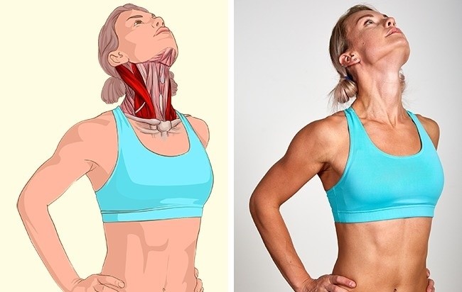 Изведба: Ставете ги рацете на колковите, исправете го грбот и внимателно навалете ја главата наназад. Ако сакате истегнувањето да биде уште подлабоко, ставете ги дланките на челото и внимателно туркајте назад.
