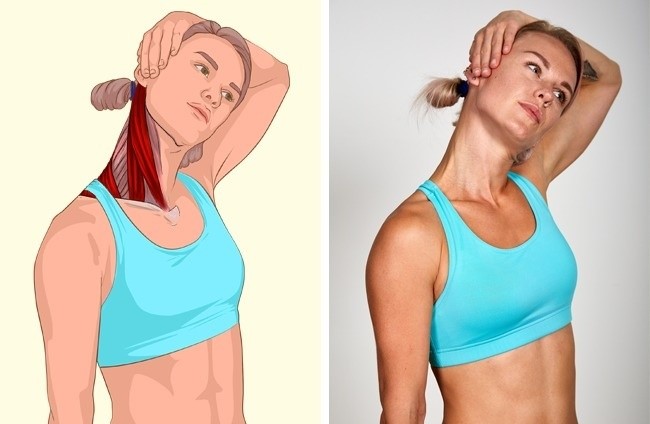 Изведба: Седнете, исправете го грбот и со помош на левата рака навалете ја главата кон левата страна. Обидете се да го допрете рамото со вашето уво. Повторете ја вежбата на другата страна.