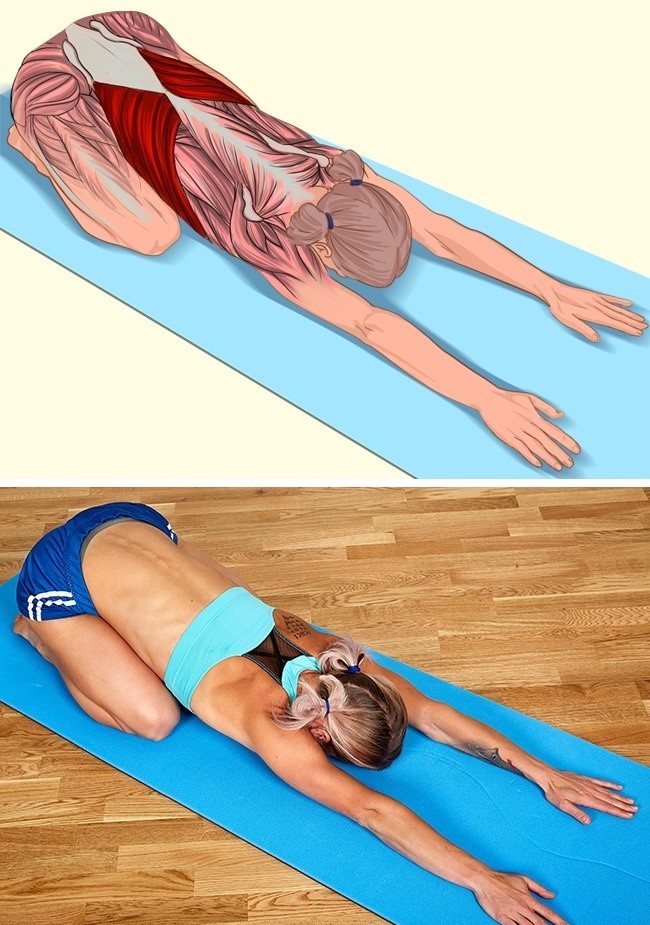 Изведба: Застанете на сите 4 и бавно спуштајте ги колковите наназад. Обидете се да го допрете подот со вашето чело.