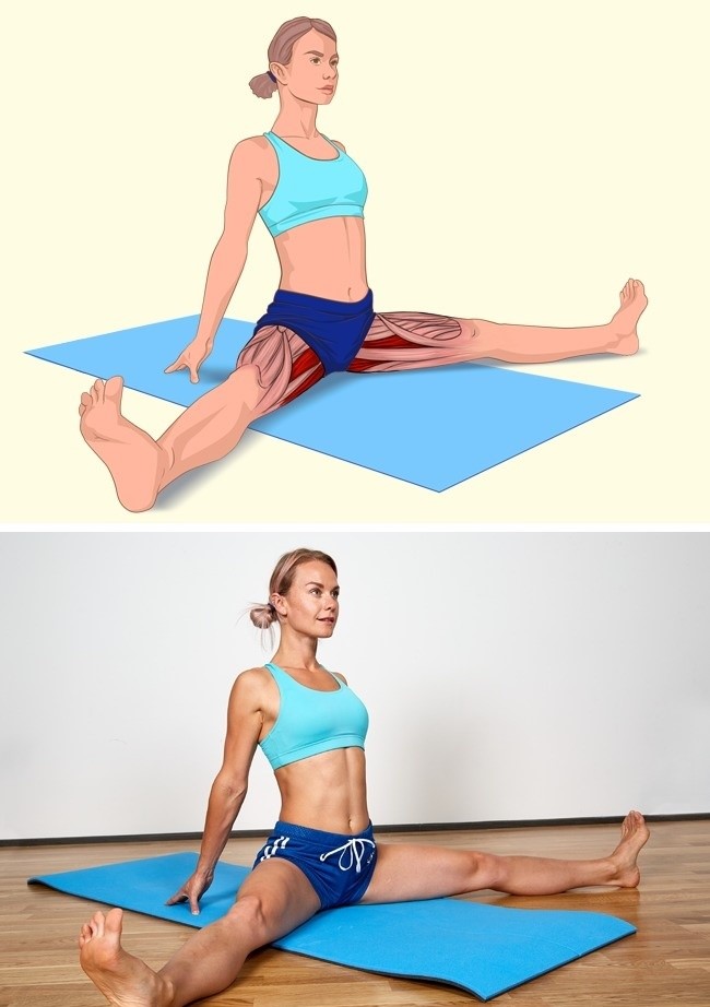 Изведба: Седнете на подот и раширете ги нозете. Немојте да ги виткате колената, а нозете нека ви останат на подот. Наведнете се напред лизгајќи се со рацете, и исправете се на истиот начин.