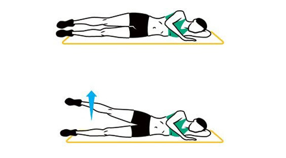 Легнете на левата страна, главата потпрете ја на левата рака, а со десната придржувајте се на земјата. Нозете држете ги исправено, а стапалата истегнете ги така што прстите ќе ви бидат свртени накај главата. Без промена на кој било друг дел од телото, подигнете ја десната нога, задржете ја во воздух неколку секунди, а потоа спуштете ја. Важно е цело време мускулите да ви се стегнати. Оваа вежба делува на мускулите на внатрешната страна на бедрата и колковите.