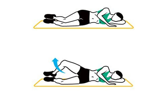 Лежејќи на левата страна, свиткајте ги колковите и колената под агол од 45 степени. Петите држете ги споени и почнете да ја подигате десната нога колку што можете повисоко. Најважно е да не ги одвојувате петите и мускулите да ви се постојано затегнати. Држете ја десната нога една секунда во воздух, па потоа вратете ја во првобитната положба. Оваа вежба делува на мускулите на задникот, колковите и задниот дел од бутовите.