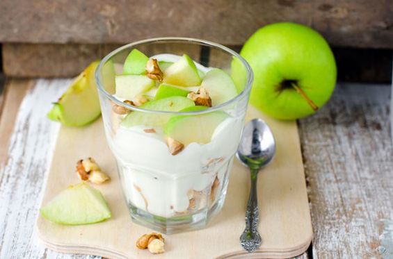 Земете стаклена чаша и почнете да редите слоевито, ред ореви, ред јаболка, ред од кремот. Наполнете ја чашата до врв и потоа уживајте во прекрасниот вкус.