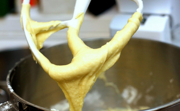 Загрејте ја рерната на 200 ˚C. Тавата каде ќе ги печете колачите, испрскајте ја со спреј за печење или обложете ја со хартија за печење. Во голем сад додајте ги шеќерот и путерот. Измешајте со миксер или со рака, потоа додајте ги јајцата (едно по едно, не сите одеднаш), млекото, како и екстрактите од ванила и лимонов сок. Добро измешајте додека смесата не згусне.