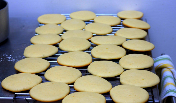 Со супена лажица земајте од смесата. При секое црпење полнете ја лажицата и внимателно оставајте ја смесата врз хартијата за печење формирајќи кругови. Внимавајте круговите да бидат оддалечени околу 5 сантиметри еден до друг. Печете околу 20-тина минути, додека не потемнат краевите на колачињата. Потем оставете добро да се оладат.