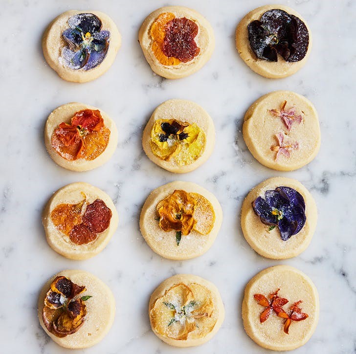 Во посебен сад, изматете ја белката заедно со 1 супена лажица ладна вода. Со оваа смеса намачкајте ја површината на колачињата и поставете им ги цветовите во центарот. На крај, просејте го и шеќерот во прав врз нив.