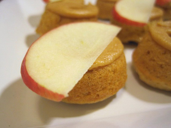 Мафините премачкајте ги со путерот од кикирики. По желба, врз путерот можете да наросите пченични зрнца. Врз секој мафин ставете по една кришка јаболко.