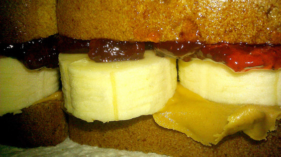 Намачкајте четири парчиња милиброд со путер од кикирики. Врз путерот нанесете тркалца банана. Останатите четири парчиња милиброд намачкајте ги со мармалад и ставете ги врз бананата. Вака добиените сендвичи пресечете ги дијагонално и послужете ги.