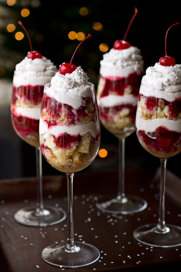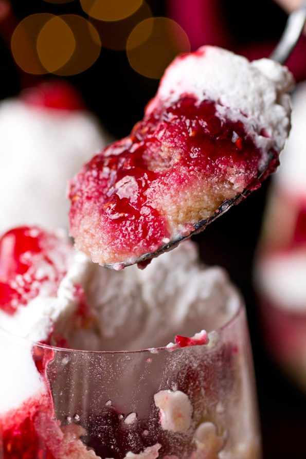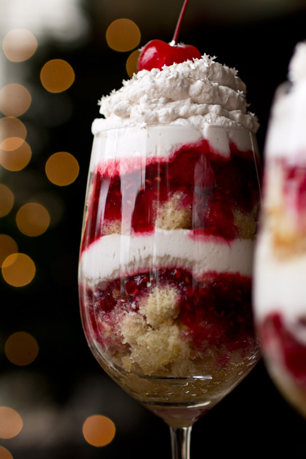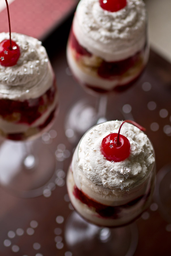 За да го составите десертот целосно, наместете ги чашите во линија пред вас. На дното од секоја чаша ставете по 30 грама од коцките торта. Врз нив сипете околу 1½ лажичка ликер од портокал. Потоа сипете и по 3 полни лажички од мешавината со малини, така што ќе ѝ дозволите да паѓа надолу по ѕидовите на чашата. Извадете ја шлаг пената од фрижидер и полека преку отворот додадете од 35 до 50 грама врз мешавината од малини, започнувајќи од рабовите и полека кружејќи кон центарот на чашата. Повторете го сето ова уште еднаш. На крај, за декорација ставете по една цреша во секоја од чашите и додадете еден прстофат од сребрените чоколадни трошки.