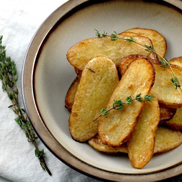 - Загрејте ја рерната на средно висока температура. Наредете ги компирите на обложено тавче во еден ред, ставете повеќе маслиново масло, сол и бибер и пикнете ги да се печат. Печете додека не добијат кафена боја одозгора, односно околу 7 минути, а потоа превртете ги парчињата и печете ги од другата страна уште 5 минути. Сервирајте ги топли.