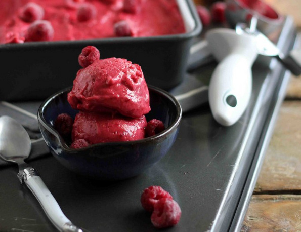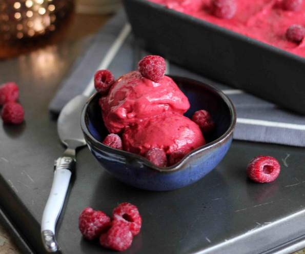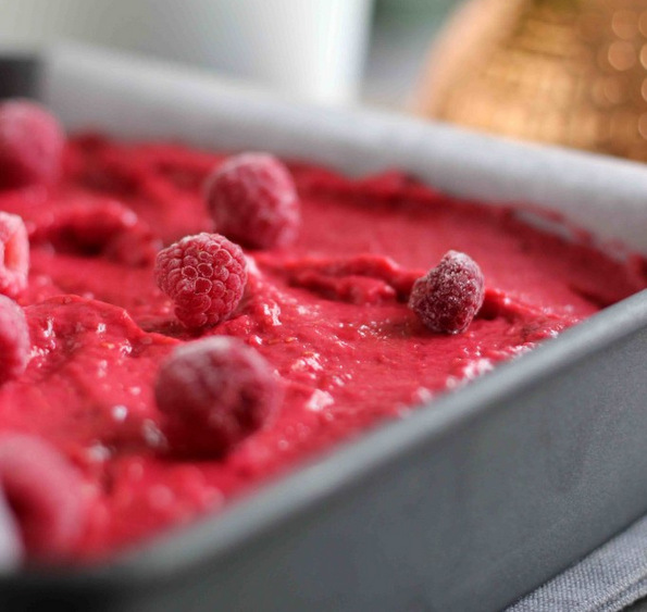 Со помош на миксер матете ги сите состојки сè додека добро не се соединат, а потоа префрлете ги во голем сад и замрзнете ги. При сервирање, за декорација додадете смрзнати малини или друг вид шумско овошје.