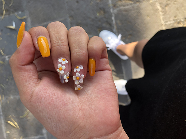 За свеж и разигран изглед на ноктите одберете цветни украси во жолта боја. Самиот цветен детаљ ќе привлече внимание. Доколку сакате подискретен изглед, едниот нокт украсете го на овој начин, а останатите нокти налакирајте ги во посакуваната пастелна нијанса.